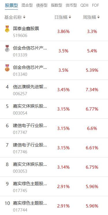 南方财经1月20日电,根据南财基金通数据:2025年01月17日当日收益靠前的股票型基金包括:国泰金鑫股票型证券投资基金(519606,日收益3.86%);创金合信芯片产业股票型发起式证券投资基金(013339,日收益3.5%);信澳先进智造股票型证券投资基金(006257,日收益3.45%)等。收益较低的股票型基金包括:西部利得事件驱动股票型证券投资基金(671030,日收益-1.96%);鹏华文化传媒娱乐股票型证券投资基金(001223,日收益-1.01%);前海开源优势蓝筹股票型证券投资基金(001162,日收益-0.55%)等。